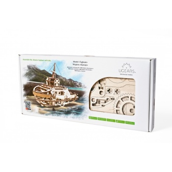Puksiiril on väga omanäoline ja huvitav mehhanism. Selle üksikasjalik kere on loodud liikumismehhanismi jälgimiseks. Puksiir töötab kummimootoriga, mida toidab laagriga ühendatud kummi pinge. Reduktor edastab energiat veorattale ja edasi asümmeetrilisele rattapaarile. Pendel aeglustab ja tasandab puksiiri liikumist. Rattapaari asümmeetria annab mudelile ainulaadse liikumisviisi, imiteerides spetsiifilist müra, mis sarnaneb paatides tõelise diiselmootori poolt tekitatud müraga. Mudelil on kaks käigukangi, üks neist peatab mehhanismi ja teine käivitab selle. Kasutage kahte köit, et transportida väikesed veoseid. Puksiirlaev sõidab 1,5-3 meetrit, olenevalt pinnast.